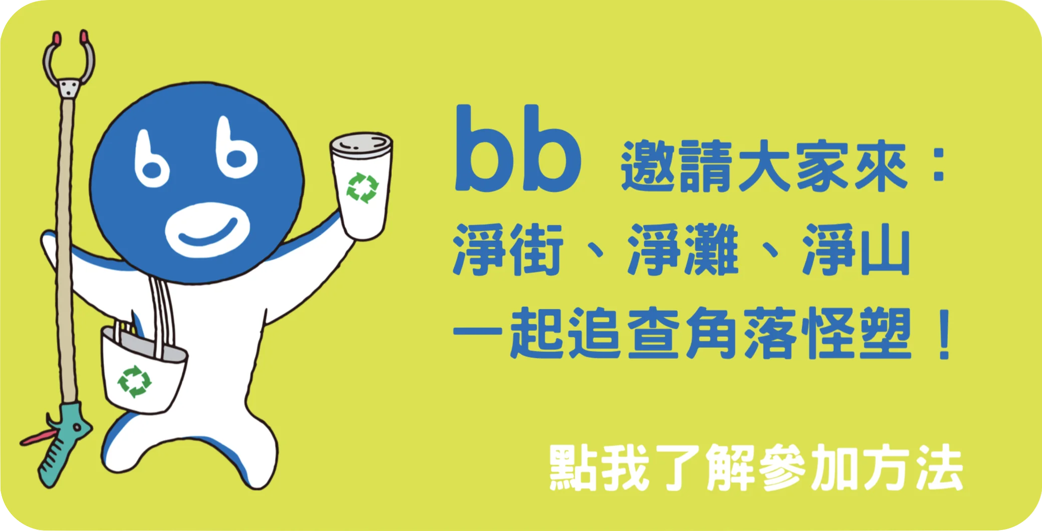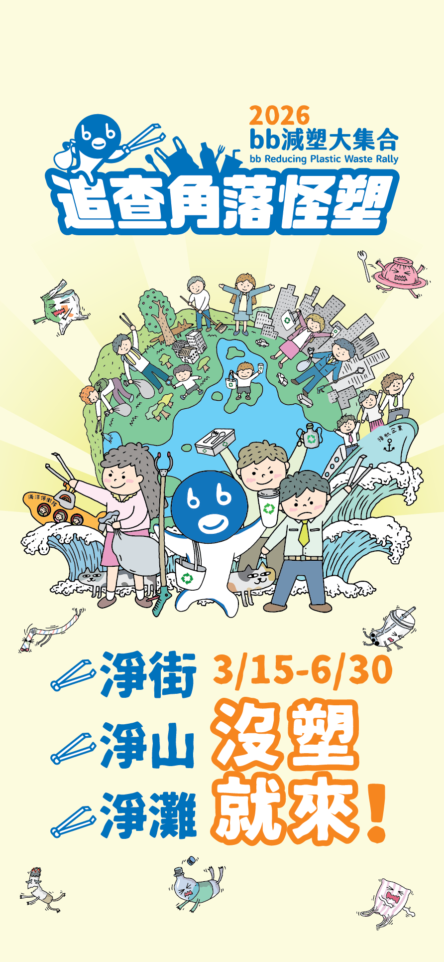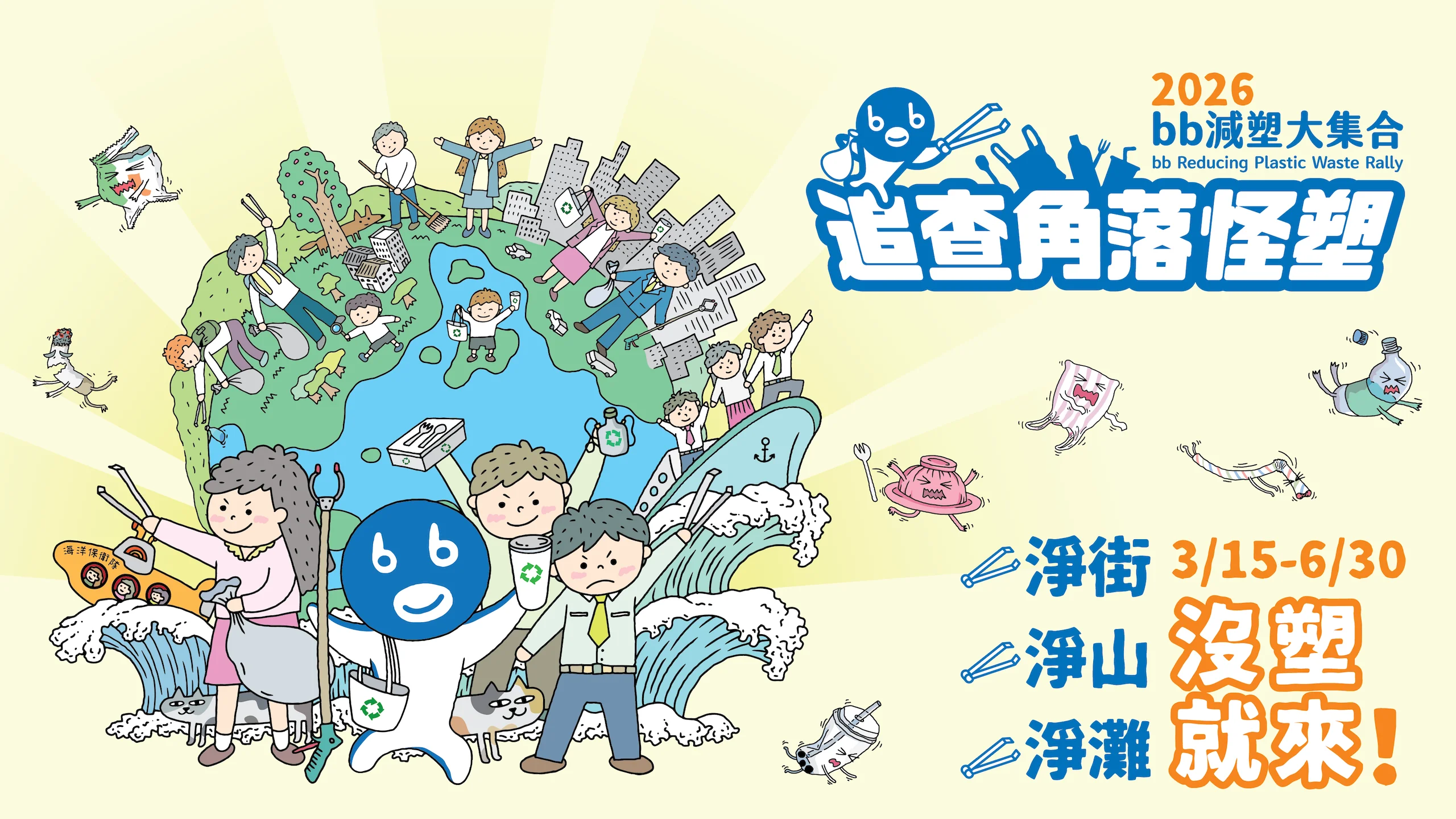2026 年慈心淨塑再度推出「bb減塑大集合」追查角落怪塑,開啟每年度減塑的集體行動:用淨街、淨灘、淨山,追查四散各地的角落怪塑。